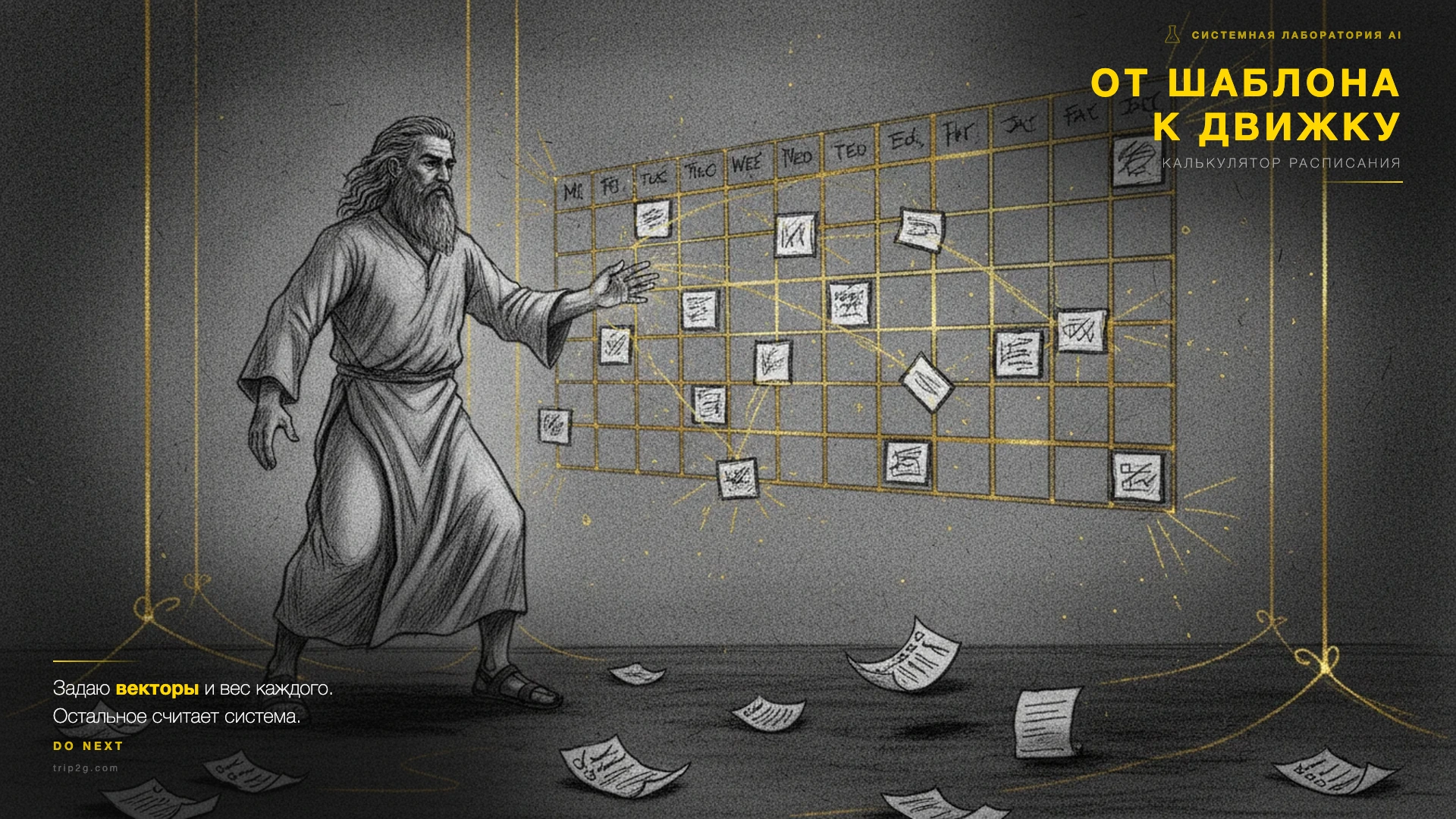 Следующий шаг: превратить генератор в калькулятор, который сам перестраивает неделю. Задаю векторы и вес каждого, остальное считает система.
